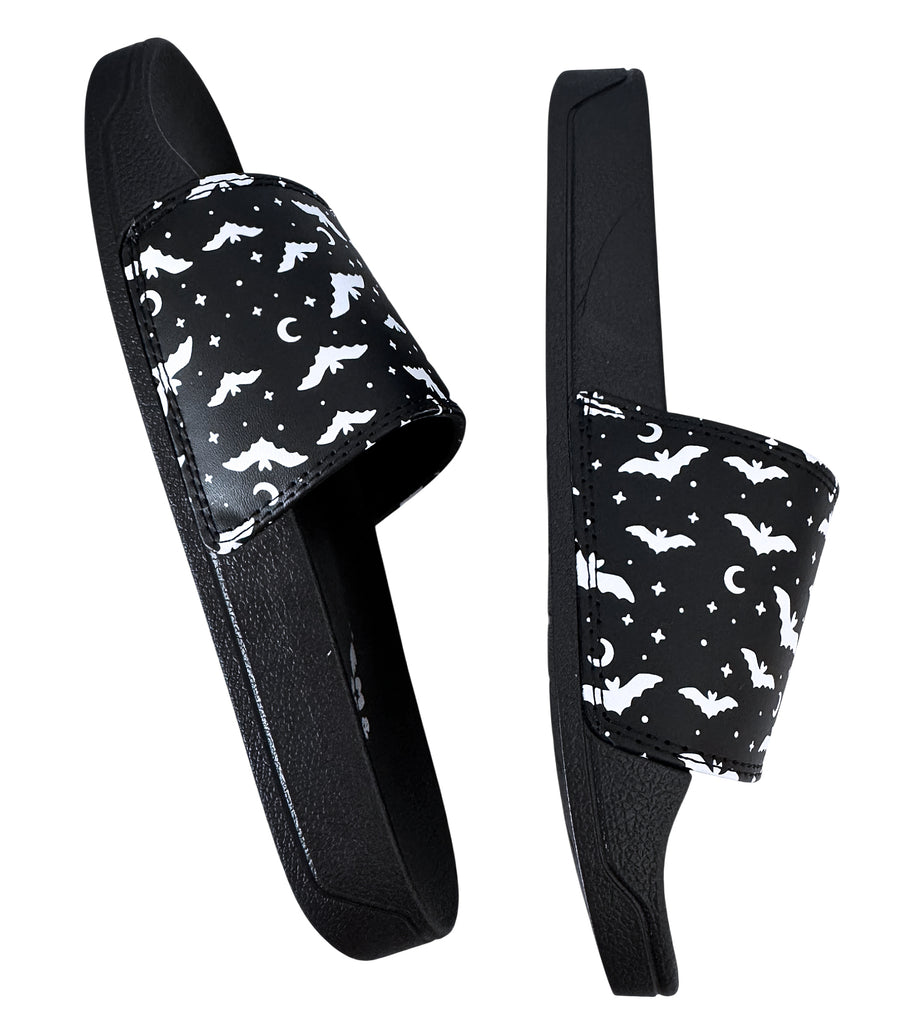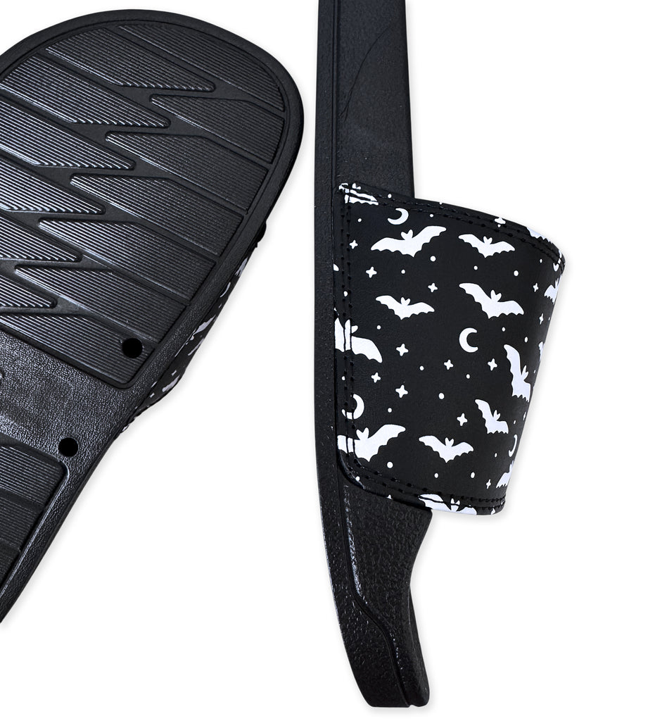 These spooky cute bat slides are so much fun! The upper is a durable and comfortable padded polyurethane and the soles are black and made of thick rubber, suitable for outdoor use and weatherproof! The soles are soft and cushy. If you're a half size we suggest ordering up.