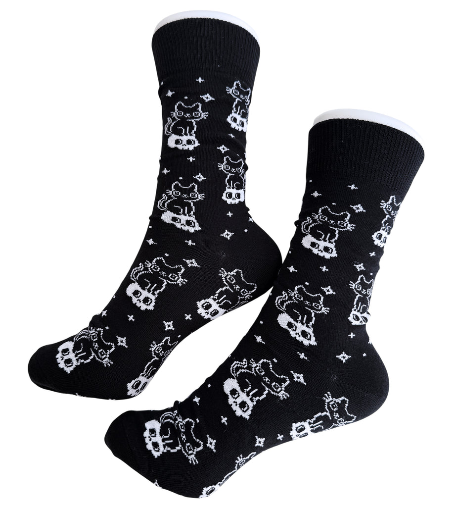 These socks feature my cat skull design and come on a black background with black trim. They're women's one size fits all, super comfy, soft, and stretchy! Made with a cotton/spandex blend and are machine washable (cold setting.)