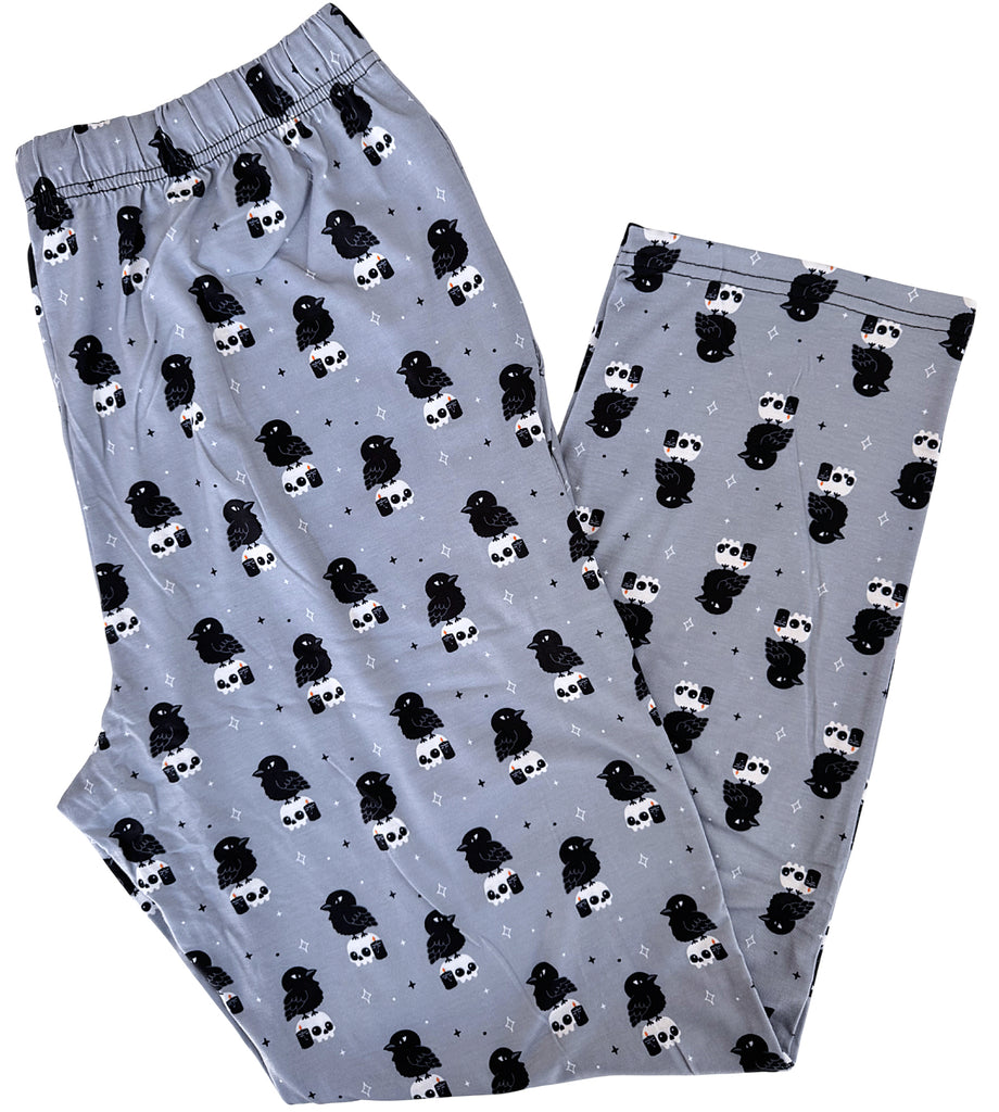 A fun and comfy pair of pajama pants featuring my crow & skull print! These PJ pants come in sizes Small - 4X. They're made of a cotton/poly blend and are super duper soft, stretchy and comfy. They also have pockets! Please note that these are stretchy so there is wiggle room with the measurements - there is also elastic and a tie in the waist and they will stretch quite a bit more than the measurements listed if you need it.