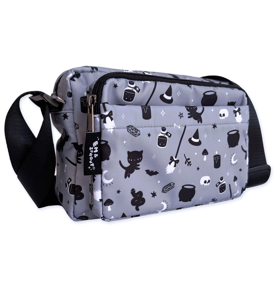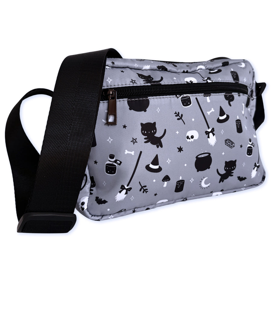 I've been wanting to offer a highly functional utility style bag and this crossbody basically has it all! It features my gray witchy print allover and has tons of space, zippered pockets and pouches, is weatherproof, and is just such a perfectly fun little bag to take with you on outdoor adventures, theme parks, or to use day to day (like me!)