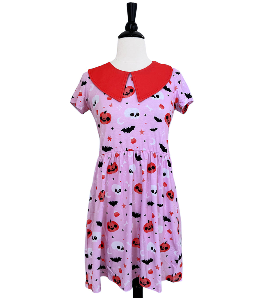This adorable dress features my pink Halloween print allover with a super fun orange collar to match. The silhouette of this dress is super cute with a fitted top and flared out bottom. It also has POCKETS! Yes! 35% cotton and 65% poly for a comfortable stretch. Machine washable on cold/gentle cycle and hang to dry. Or hand wash if you prefer.