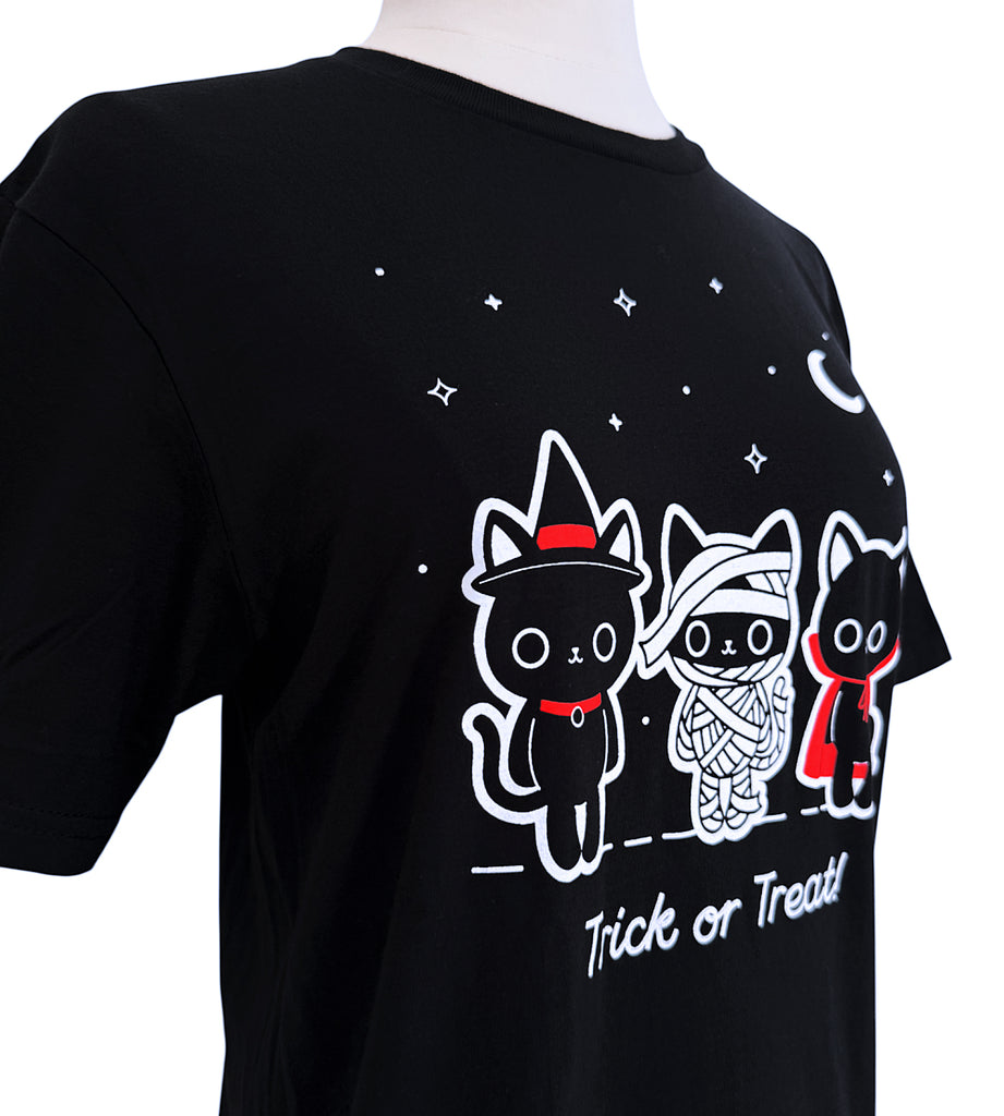 My Trick Or Treating Cats design has been made into a t-shirt! All apparel is professionally screenprinted. This design is printed in lavender & white ink onto a black, super soft, ringspun unisex t-shirt.